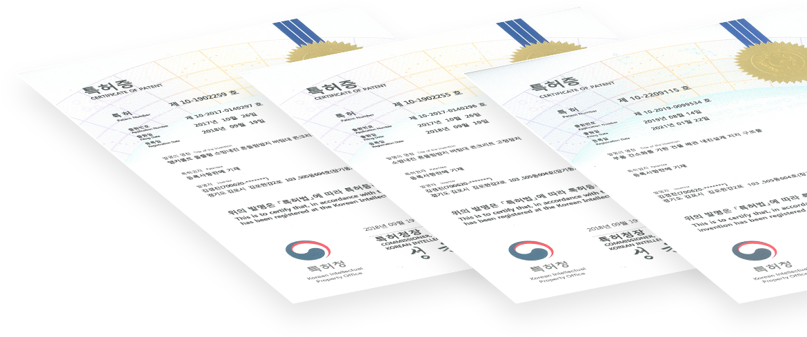 2020 메인비즈, 2020 이노비즈, 2021 ISO 9001 등 다양한 인증과 특허를 보유하고 있습니다.