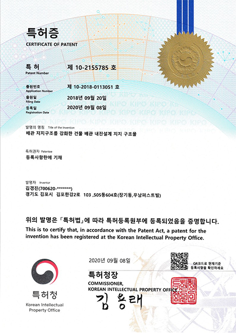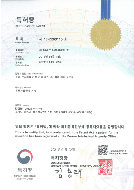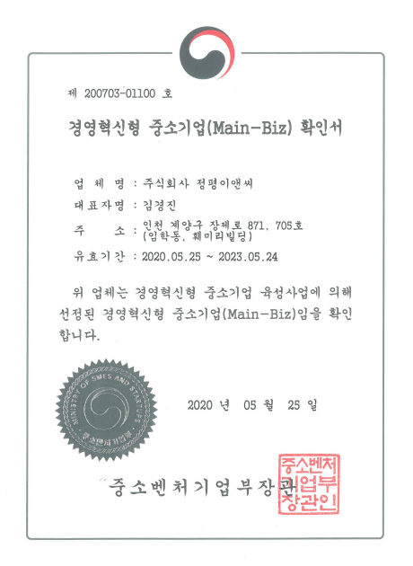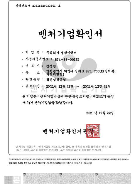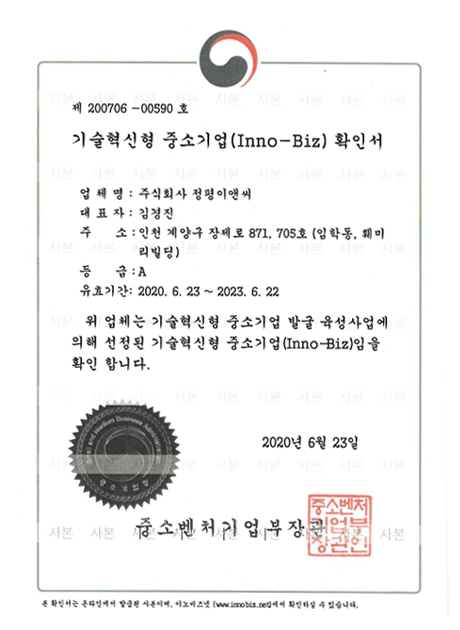 2020 메인비즈, 2020 이노비즈, 2021 ISO 9001 등 다양한 인증과 특허를 보유